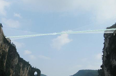 這座玻璃橋位于張家界大峽谷景區(qū),是世界最高、跨度最長的玻璃橋,大橋建在大峽谷兩側(cè)的峰頂上,橫跨大峽谷,橋拱距谷底相對高度約400米,全長約370米,橋面全部采用透明玻璃鋪設(shè),橋中心有全球最高的蹦極。站在橋上,腳下400米處的谷底全景盡收眼底。玻璃主橋建成后將申報(bào)吉尼斯世界紀(jì)錄。