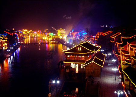 幕色中的鳳凰,四處彌漫著古老而又神秘的氣息,讓人忘了置身何處,今夕何夕。夜色漸濃,沱江上漸漸升騰起一層霧氣,兩岸的燈火漸漸燃起,小街兩旁點著燭光的銀飾攤越來越多,紅紅的燈籠也齊齊地亮了起來,倒影在水中,撲朔迷離,虛實難分。